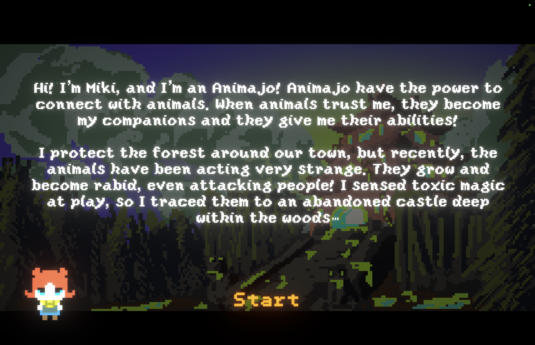 "Hi! I'm Miki, and I'm an Animajo! Animajo have the power to connect with animals. When animals trust me, they become my companions and they give me their abilities!